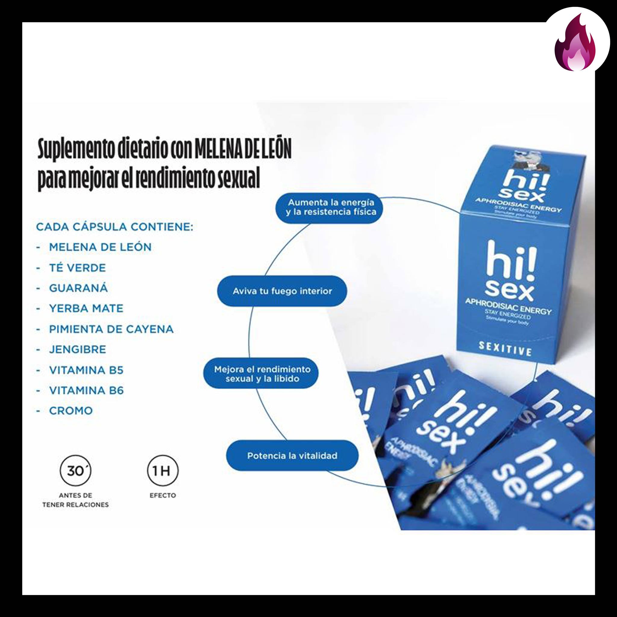 Despertá tu deseo y potencia tu vitalidad con Hi! Sex – Aphrodisiac Energy, un suplemento dietario creado para avivar tu fuego interior. Formulado con vitaminas B5 y B6, cromo y un seductor complejo afrodisiaco con té verde, melena de león, guaraná, yerba mate, cayena y jengibre, esta fórmula única está diseñada para elevar tu energía, mejorar tu desempeño sexual y revitalizar tu cuerpo para momentos de pura conexión.